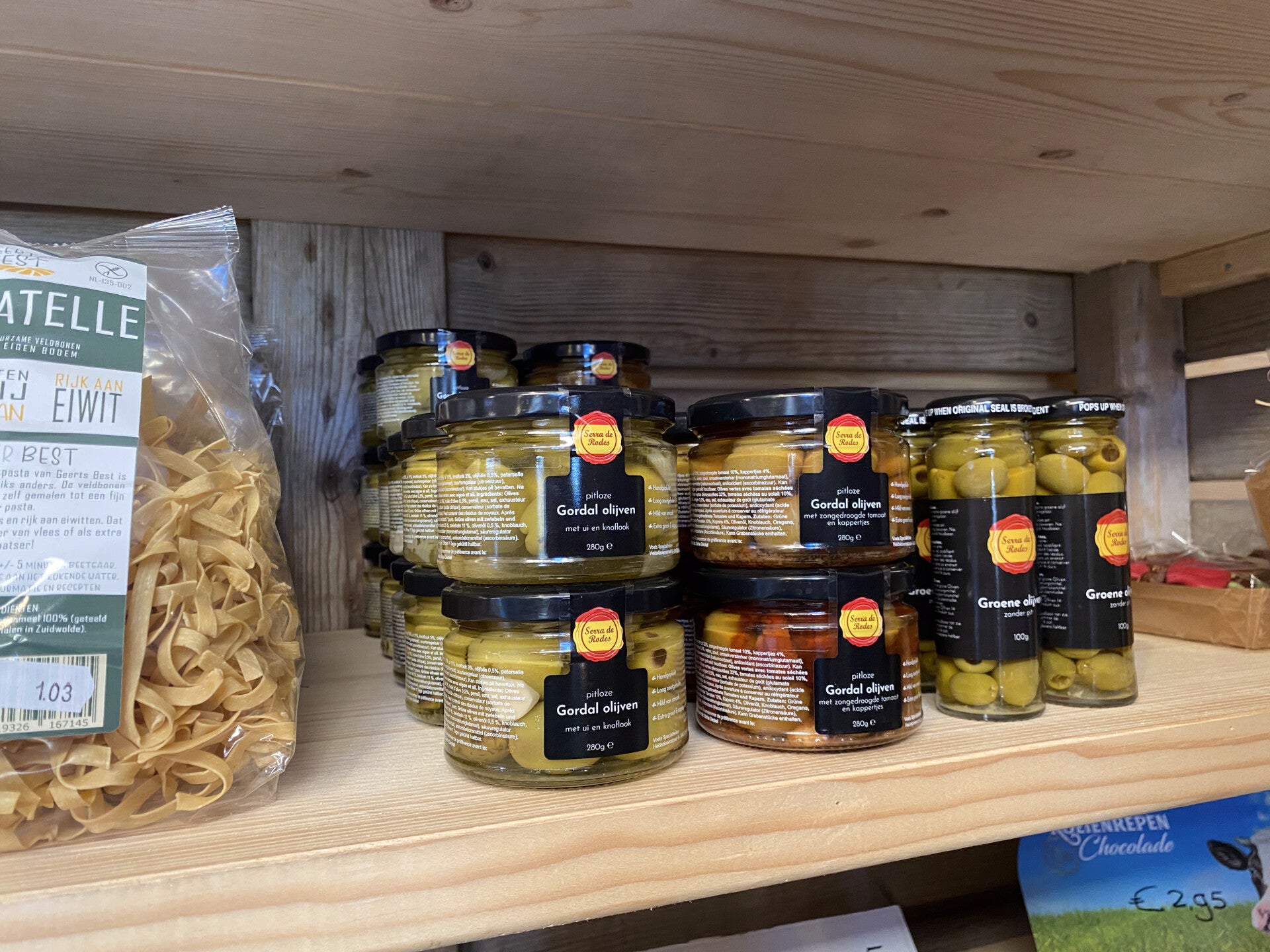 Nog meer voor op de borrelplank, pitloze olijven met diverse smaken: ui en knoflook, zongedroogde tomaat en kappertjes en de traditionele olijven.